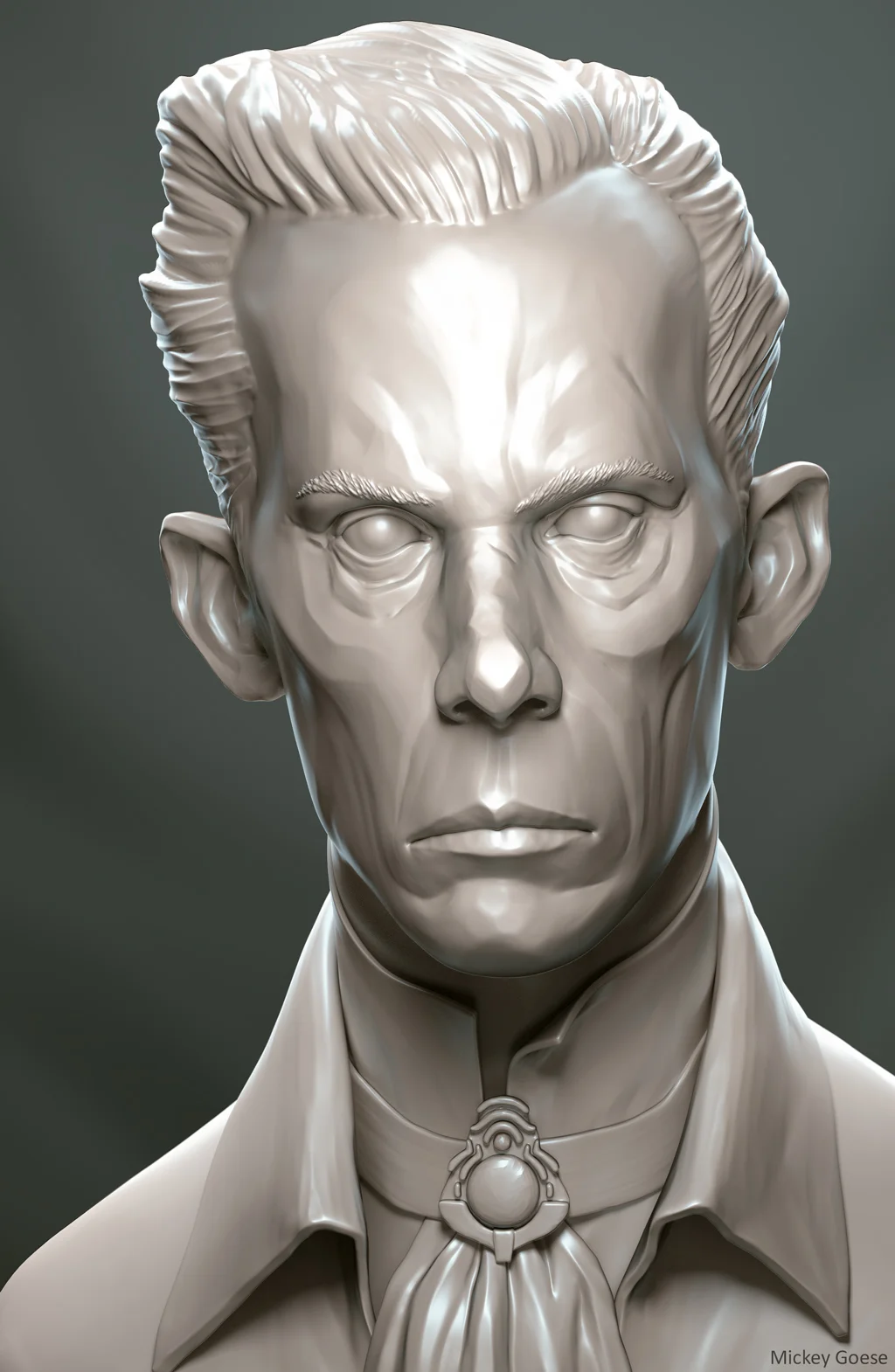 I focused most on the front of the face to create the portrait. This was made during CGMA Character Casting Class so big thanks to Peter Zoppi's instruction and critiques. Working in this style was a lot of fun, the goal was to achieve a painterly look by keeping brush strokes visible in the sculpt, having crisp edges and flat planes with careful lighting to achieve geometric highlights on the skin.